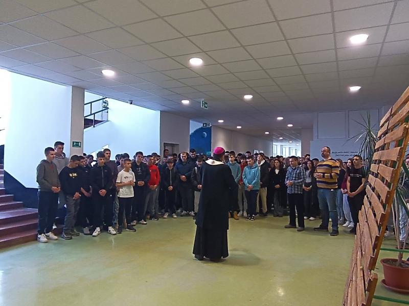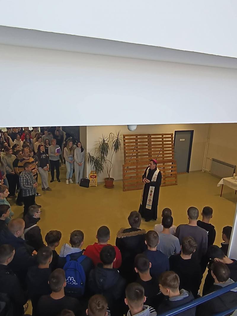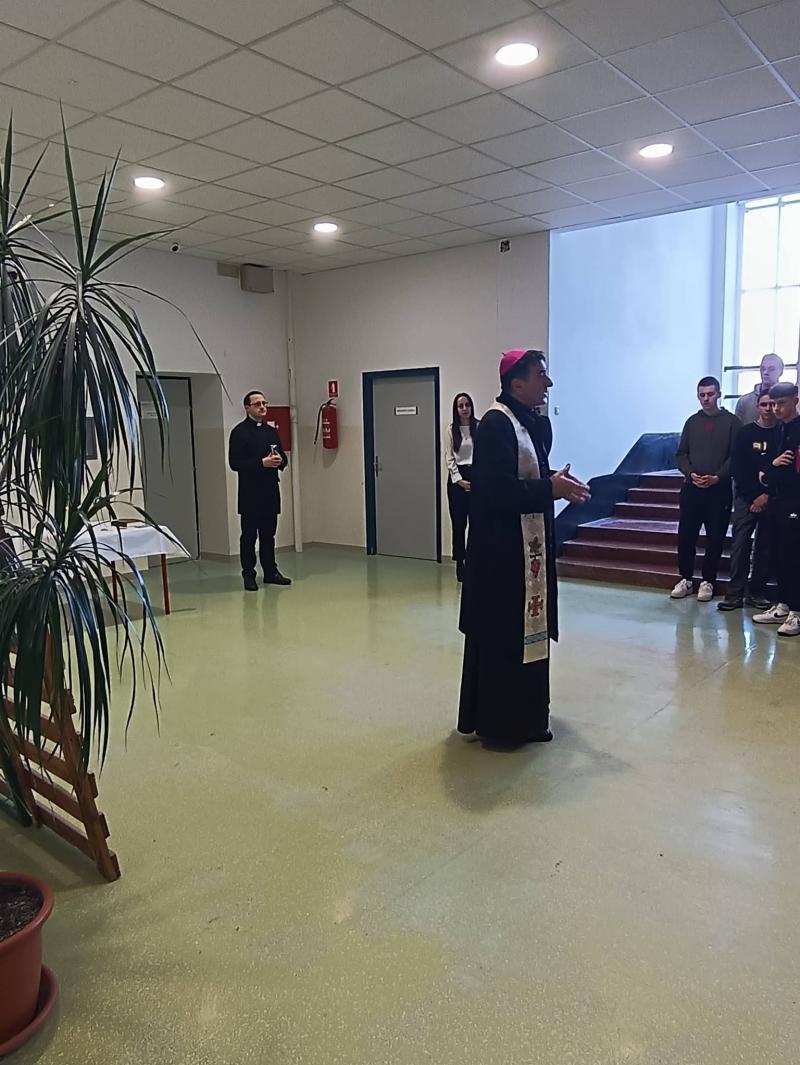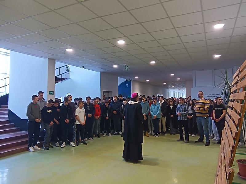 Danas je Strukovnu školu, u pratnji kancelara Mišela Grgurića, posjetio gospićko-senjski biskup mons. Marko Medo koji je blagoslovio učenike i djelatnike škole te im se obratio prigodnim i nadahnutim riječima. U svom govoru biskup je učenicima progovorio vrlo osobno, podsjetivši ih da se i sam, unatoč životnom pozivu koji danas živi, i dalje jasno sjeća školskih i fakultetskih dana. Prisjetio se nastavnih predmeta koji su mu bili posebno zahtjevni, kao i profesora koji su tražili mnogo truda, discipline i ustrajnosti. Iako mu tada nije uvijek bilo lako, danas na ta iskustva gleda sa zahvalnošću jer su ga upravo takvi izazovi oblikovali, izgradili njegov karakter i pripremili za životne odgovornosti koje je kasnije preuzeo. Naglasio je kako se i sam često nalazio pred teškim situacijama kada je morao puno učiti, ali nikada nije odustajao, već je korak po korak rastao kroz trud i vjeru u smisao onoga što radi. Obraćajući se učenicima, biskup je istaknuo kako razumije da im je ponekad teško slušati savjete, upozorenja i „prodike“ roditelja i profesora. Ipak, poručio im je da upravo sada, u ovim godinama, grade sebe kao osobe, svoj životni put i svoje znanje. Pozvao ih je da i onda kada im je teško daju sve od sebe, jer svaki uloženi napor ima svoju vrijednost, čak i onda kada se ona ne vidi odmah. Na poseban je način naglasio da su mladi budućnost, ne samo svoje škole, nego i svoga grada, sela i domovine. Ohrabrio ih je da vjeruju u sebe, ne bježe od izazova i ne boje se zahtjeva koji se pred njih stavljaju, jer upravo kroz takve trenutke rastu i postaju obrazovani ljudi sposobni mijenjati svijet nabolje. Svojim iskrenim i životnim riječima biskup se približio učenicima, ostavivši snažnu poruku nade, ustrajnosti i odgovornosti, te ih potaknuo da s povjerenjem i hrabrošću nastave svoj put obrazovanja i osobnog rasta.