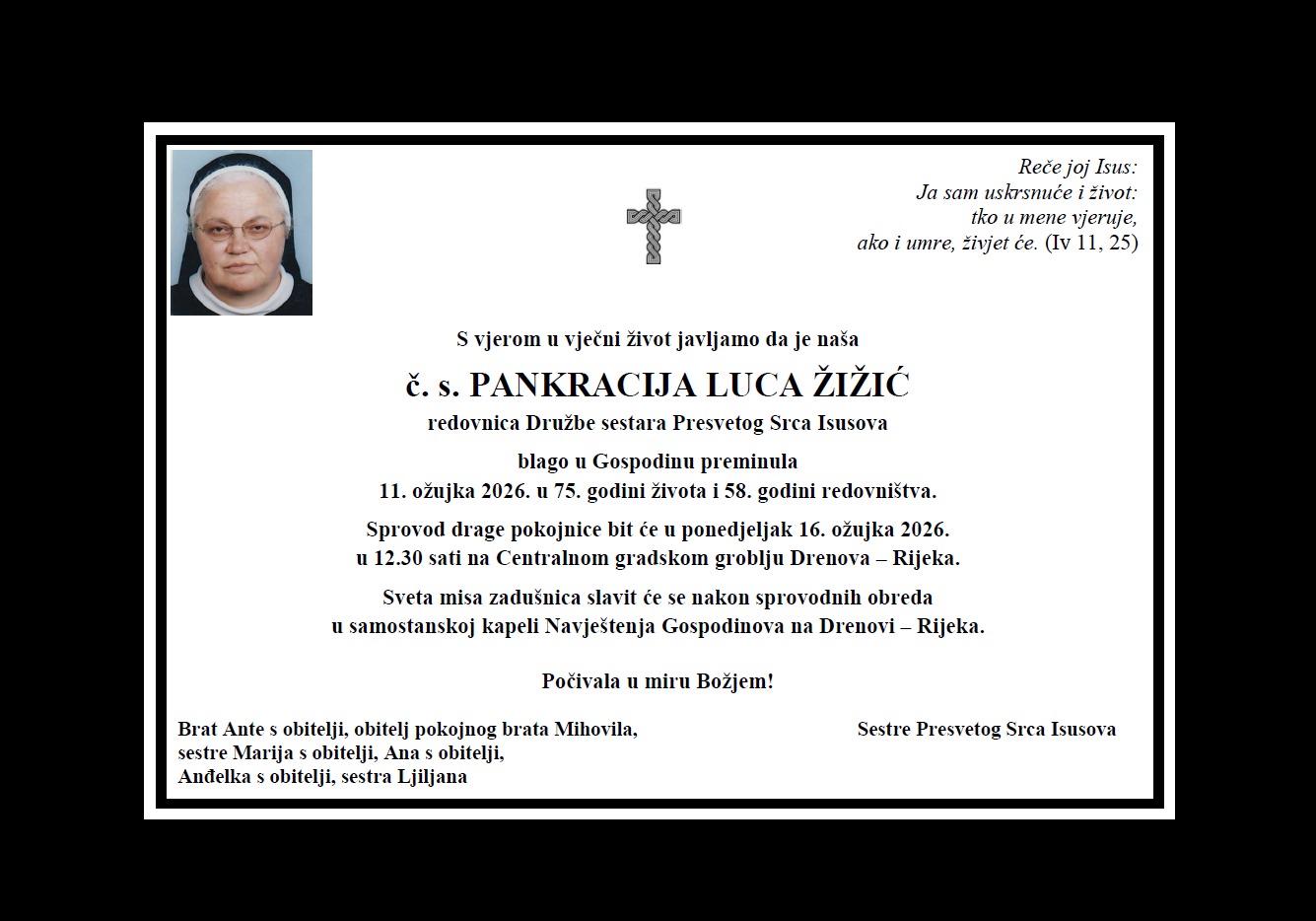 Sprovodni obredi bit će u ponedjeljak, 16. ožujka 2026. u 12:30 sati na Centralnom gradskom groblju Drenova u Rijeci.